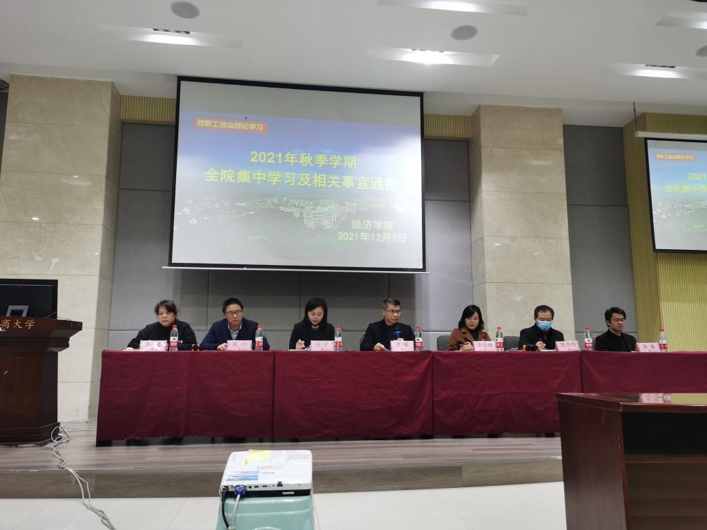 会上,李自维领学了党的十九届六中全会精神。她从三个历史决议、四个“伟大成就”、三个“需要”、两个“确立”、三次历史性“飞跃”、十个“坚持”、一个根本及四个“必须”等八方面全面深入地解读了全会精神。她强调,党的十九届六中全会是在党的百年华诞之际召开的一次重要会议,承前启后,继往开来,是一篇在新的历史交汇点接续奋斗、砥砺前进的纲领性文献。李自维强调,认真学习宣传贯彻全会精神是学院当前及今后一个时期首要的政治任务,全院师生要从“学懂弄通做实”入手,确保全会精神入脑入心,落地落实。首先,要面向师生抓学习。全院上下要迅速行动起来,特别是十三个基层党支部及员工各班级,要在院内迅速兴起学习宣传贯彻全会精神的热潮;其次,要利用优势抓研究。充分发挥好应用经济学重庆市一流学科和学院人才优势,要科学把握全会精神的内涵实质,全力做好全会精神学习宣传和研究阐释,积极服务党的理论创新工作;第三,要结合实际开新局。要把全会精神与全面贯彻党的教育方针相结合,与加快学院“双一流”建设相结合,紧密结合学院、各系部等改革发展中的工作实际,推动全面从严治党,落实“三全育人”,推动太阳成集团tyc122ccvip高质量发展。第四,要聚焦就业抓育人。要提高政治站位,全面统筹领导,打好“三全育人”组合拳,高度重视人才培养质量,切实分析研讨并做好每年的招生就业工作,坚持“三位一体”工作理念,完善“三全育人”工作体系,构建多层次宣传体系,拓宽毕业生就业渠道。