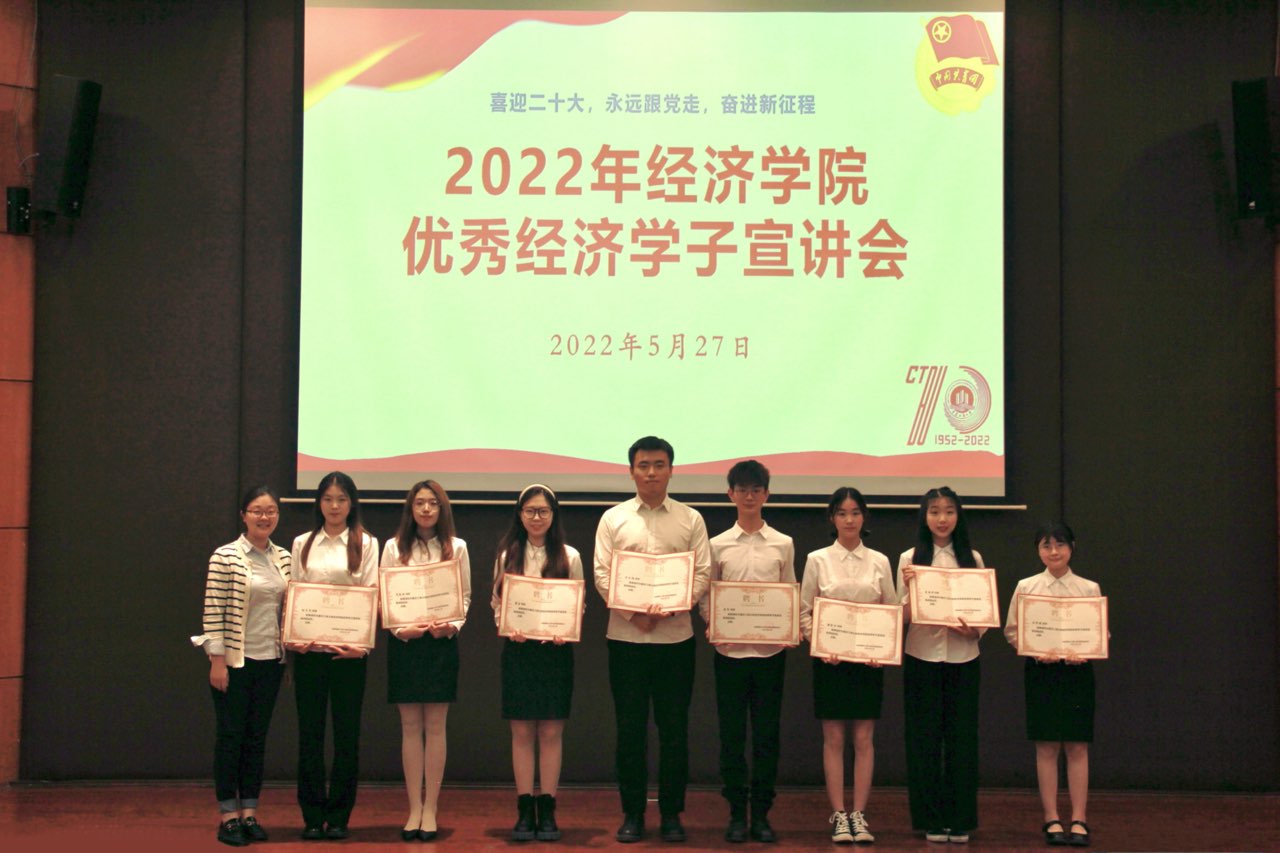 为迎接党的二十大胜利召开,庆祝中国共产主义青年团成立100周年,献礼学校七十周年校庆,引导广大青年学子励志勤学、刻苦磨炼,5月27日晚上,“喜迎二十大,永远跟党走,奋进新征程”太阳成集团tyc122ccvip优秀经济学子宣讲会于江北校区宏智楼B509报告厅成功举办,企业微信直播间同步现场情况,覆盖同学近80人次。李昂、李思炜、刘梦婷、丁方伟、潘哲宇、薛洁、闫思雨、杨员巧八位同学受邀作为宣讲团成员参与此次宣讲会。