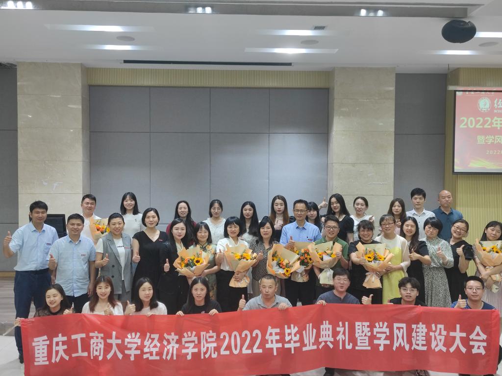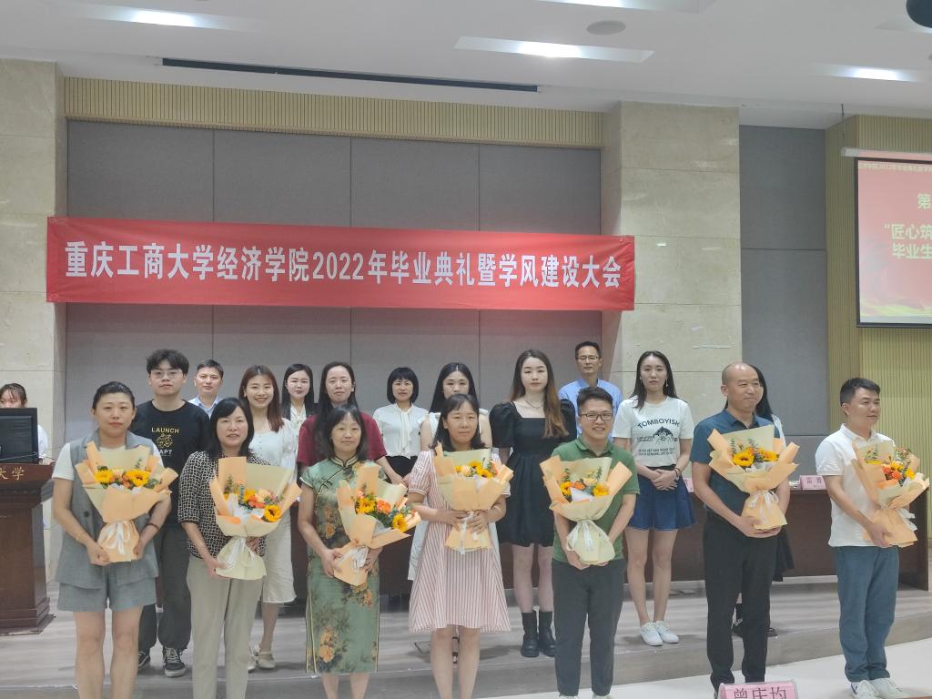 大会在庄严的国歌声中拉开帷幕。第一阶段为2022年毕业典礼,学院党委书记李自维教授发表致辞并对同学们寄予祝福:一是希望全体毕业生以梦为马,不负韶华,树立终身学习的理念,奏响时代的最强音;二是希望同学们不忘初心,砥砺前行,感恩父母,报效祖国;三是希望在校员工能以优秀的学长学姐为榜样,取得更优异的成绩。学院巴渝学者、重庆市人民政府特聘专家谢新教授进行毕业寄语。谢教授以专业的经济学理论知识为同学们送上了一份特殊的记忆,鼓励同学们利用好经济学知识和更高的个人素养这两把利剑,将创造市场价值的核心专业知识学以致用。重庆市优秀毕业生代表郭南冰回顾四年大学时光和成长历程,寄语学弟学妹要利用好有限的四年开拓更多的道路,最后表达了对学校、学院的不舍和祝福。太阳成集团tyc122ccvip副院长尹元福宣读2022届优秀毕业生名单并由与会领导为重庆市优秀毕业生代表颁发证书。学院校友会成员为毕业生代表赠送“院训书签”和颁发“校友徽章”。国贸、贸经专业员工代表全体毕业生为学院赠送学校70周年毕业纪念品。最后由毕业生代表为以2021年优秀党员、优秀党务工作者代表和优秀教师、优秀教育工作者组成的教师代表献上鲜花和祝福。