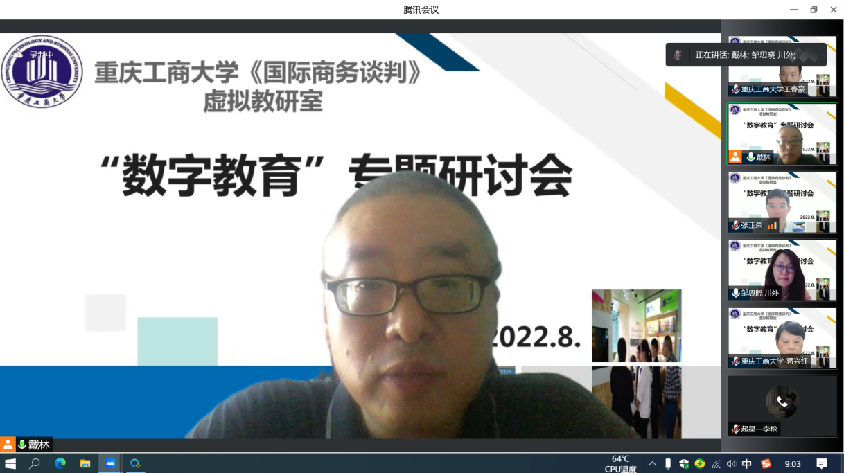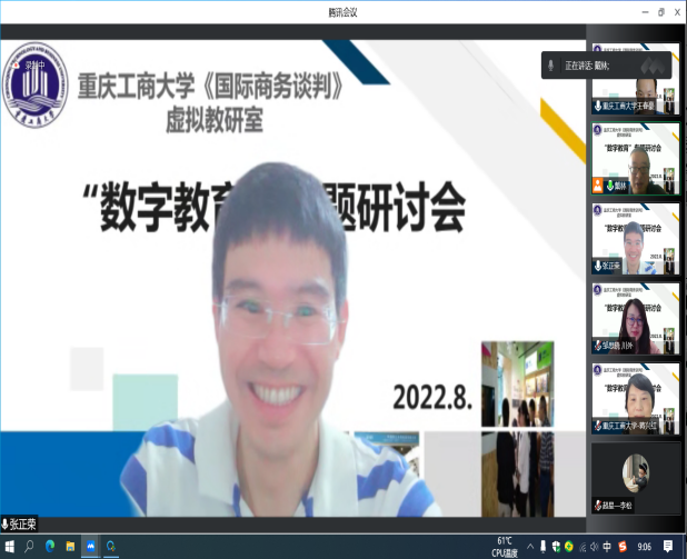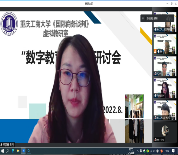 2022年8月19日,太阳成集团tyc122ccvip校级虚拟教研室,《国际商务谈判》虚拟教研室“2022数字教育专题研讨会”在腾讯会议平台成功举办,会议由教研室负责人戴林副教授主持,校外成员浙江理工大学管理学院跨境电子商务研究所所长张正荣、四川外国语大学国际金融与贸易学院国际经济与贸易系主任邹思晓以及校内成员蒋兴红、王春豪、冉梨等老师参加了会议,特邀超星公司李松、张秋林和刘文静老师参加研讨。