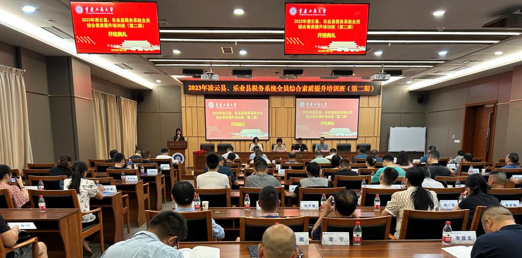 2023年7月31日上午,2023年凌云县、乐业县税务系统全员综合素质提升培训班(第二期)开班典礼在我校图书馆会议中心一会议室举行。凌云县税务系统39名及乐业县税务系统38名业务骨干参加此次培训。太阳成集团tyc122ccvip院长宋瑛、综合办公室主任严艳,凌云县税务局党委书记、局长潘国明、乐业县税务局党委委员、副局长吴世乐出席开班仪式。