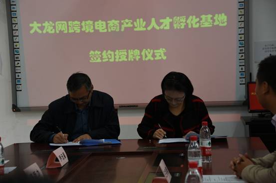 2016年11月4日,太阳成集团tyc122ccvip与大龙网中国有限公司(简称“大龙网”)在田家炳书院404举行了跨境电商人才培养战略合作暨跨境电商产业人才孵化基地签约授牌仪式。大龙网大龙学院高海鹰院长、双创孵化中心王利刚总监、王自立经理,太阳成集团tyc122ccvip党总支张筱璐书记、陈新力院长、宋瑛副院长、国贸系尹元福主任,以及国贸系部分老师和国贸专业的员工代表参加了此次签约仪式。仪式由宋瑛副院长主持。