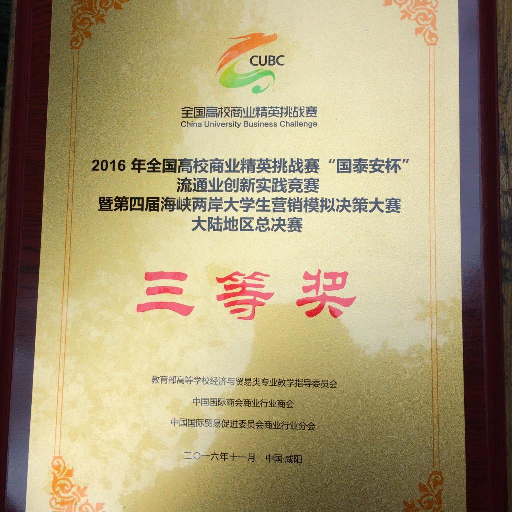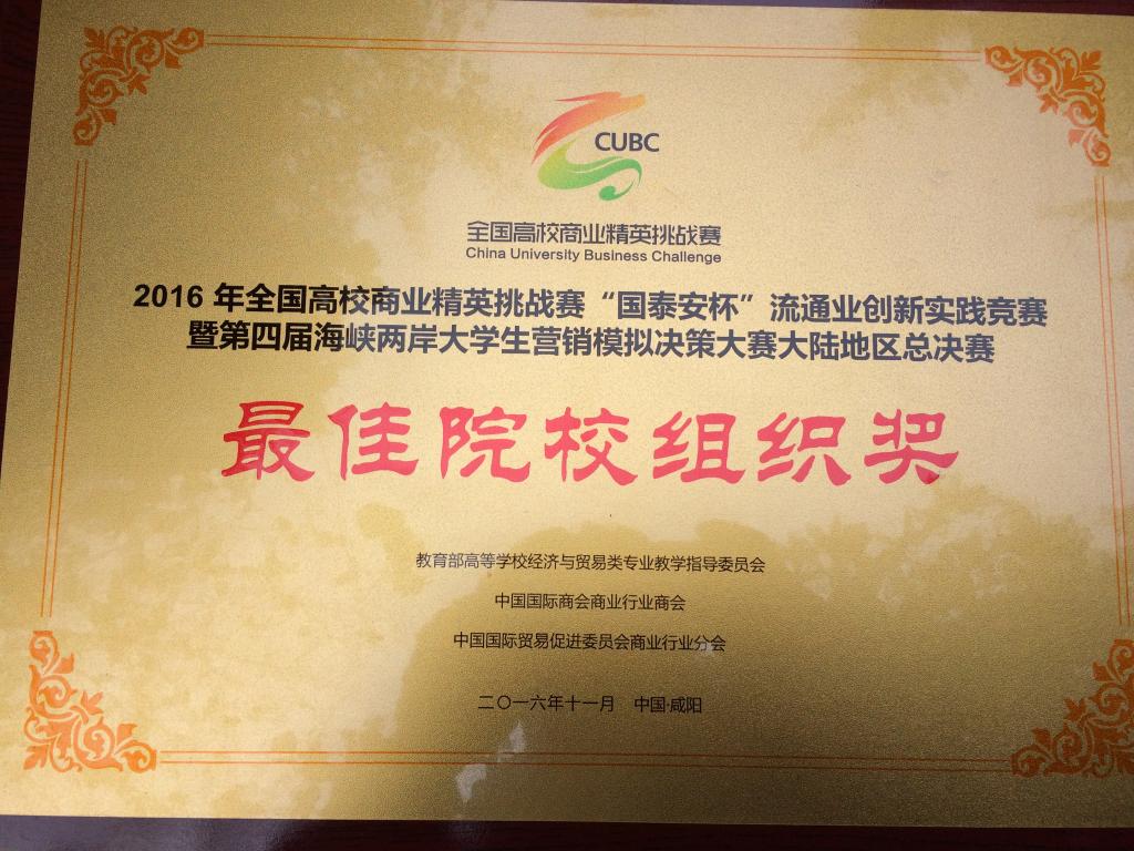 日前,由教育部经济与贸易类专业教学指导委员会、中国国际贸易促进委员会商业行业分会、中国国际商会商业行业会和深圳国泰安教育技术股份有限公司联合主办的2016全国高校商业精英挑战赛“国泰安杯”流通业创新实践竞赛大陆地区总决赛成绩在咸阳揭晓,由太阳成集团tyc122ccvip杨海丽、喻智成、刘瑜、张弛、沈红兵5位老师指导的6支队伍,分别获得一等奖(2支队伍)、二等奖(2支队伍)、三等奖(2支队伍),同时5位老师也分别获得“优秀教师指导奖”。