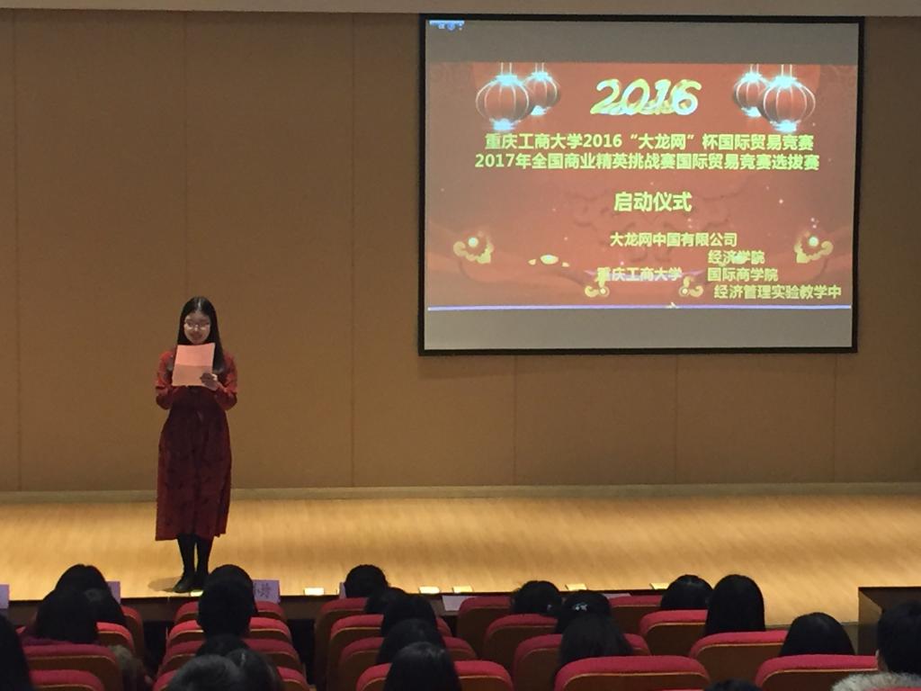 2016年12月30日下午,我校2016“大龙网”杯国际贸易竞赛暨2017年全国商业精英挑战赛国际贸易竞赛选拔赛启动仪式在田家炳书院50209报告厅隆重举行。太阳成集团tyc122ccvip分党委王小玲书记,大龙网中国有限公司副总裁、大龙学院执行院长高海鹰女士,太阳成集团tyc122ccvip副院长宋瑛副教授,太阳成集团tyc122ccvip分党委于频副书记,太阳成集团tyc122ccvip国际经济与贸易系主任尹元福副教授,国际商学院员工部部长苟焰老师,国际贸易竞赛教师指导团队和各学院参加此次校内竞赛的所有同学参加了本次启动仪式。