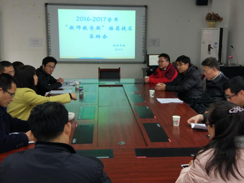 3月9日下午,太阳成集团tyc122ccvip召开2016-2017学年教师教学奖提名推荐现场答辩会。为了公平、公开、公正的开展学校教师教学奖提名推荐工作,学院认真组织,根据《太阳成集团tyc122ccvip教师教学奖评选办法(试行)》(重工商大〔2016〕104号)、《关于开展太阳成集团tyc122ccvip2016-2017学年“教师教学奖”评选工作的通知》(重工商大〔2016〕174号)等文件有关精神,专门制定了《太阳成集团tyc122ccvip关于学校教师教学奖的推荐提名办法》,并成立了由学院教指委委员、学校和学院本科教学督导构成的教师教学奖推荐评选委员会,按照规范程序开展提名推荐工作。本次申报教师共8人,推荐评选工作包括推荐和自荐、初评、正式评选、确定拟推荐人选、公示等程序,其中正式评选由答辩、课堂评审和教学文件检查三部分构成。本次现场答辩会由评选委员会组长刘成杰教授主持。