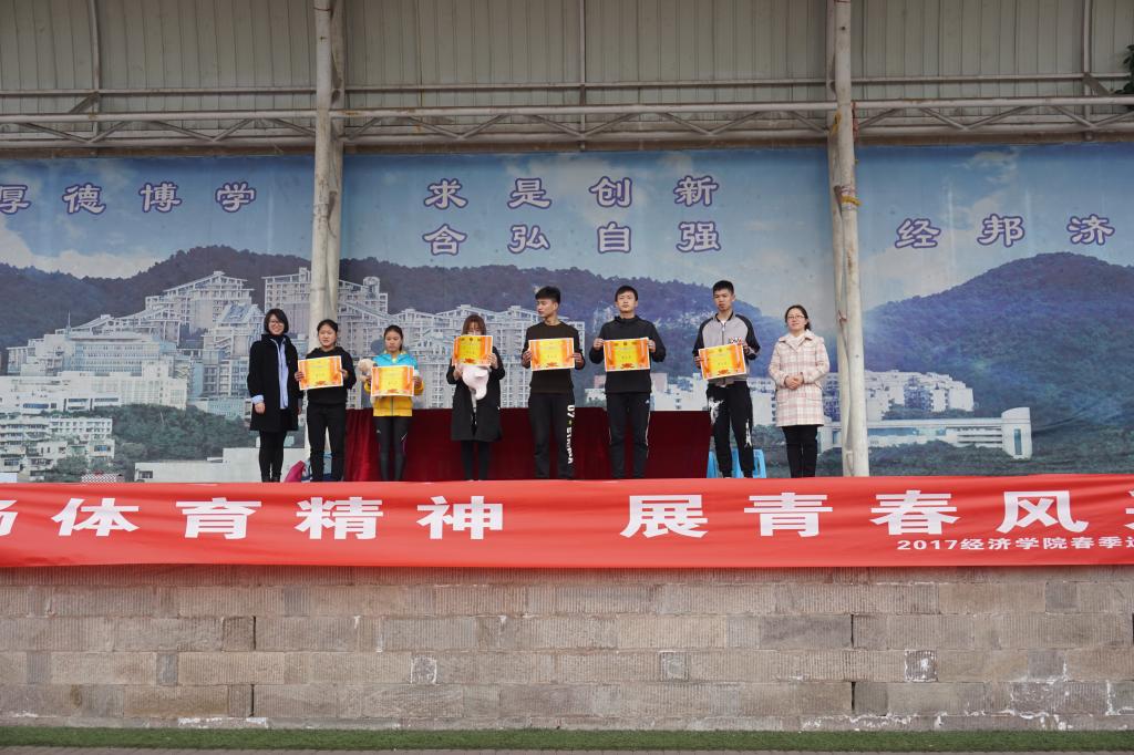 本季运动会设置了男子100米、200米、女子仰卧起坐、60米迎面接力跑等17个项目。跑道上运动员们健步如飞,跳长绳项目中队员们默契配合。每一位运动员都尽情挥洒青春和激情,为了班级和自己的荣誉努力拼搏,此起彼伏的加油声,让现场观众和运动员们在瑟瑟冷风中也感觉热血沸腾。所有运动健儿充分展现了“友谊第一、比赛第二”的体育精神,在和谐友好的氛围中相互竞技。运动会最后举行了颁奖典礼,同学们群情激昂,不断为获奖运动员们鼓掌、喝彩,15贸经三班、15贸经二班、15会展班分别取得班级总分排名一、二、三名,获得学院为其精心准备的丰厚奖品。
