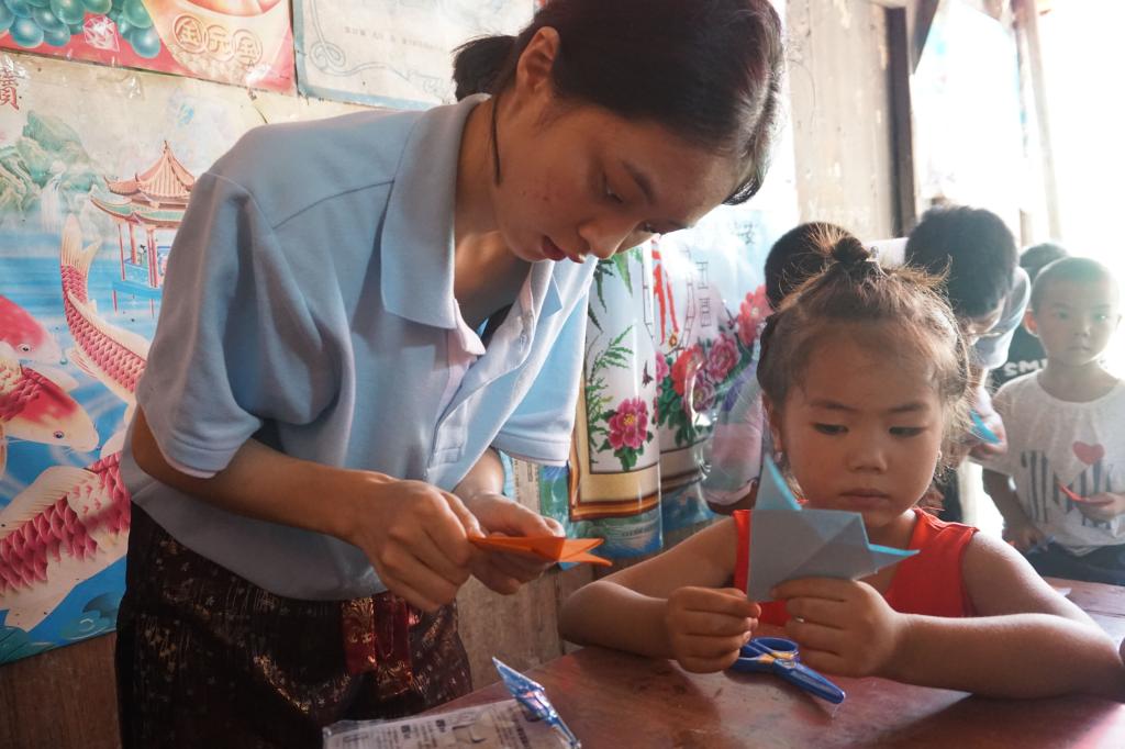 实践队员们用事先剪好的窗花勾起孩子们的兴趣,开始给孩子们简单讲解窗花的来源。窗花是贴在窗纸或窗户玻璃上的剪纸,中国古老的汉族传统民间艺术之一。实践队员在黑板上细致地画出剪纸图案,耐心地教他们剪纸。孩子们坐在课桌旁一会抬头认真听讲解,一会又拿着手中的铅笔低头认真地画着。孩子们一丝不苟地画着,一切只为能够送给爸爸妈妈一份完美的剪纸作品。画好要剪的图案后,孩子们在实践队员的引领下进行最后一步:将画好的图案剪下来。小小的手掌,厚厚的剪纸,但小朋友们并没有觉得剪起来费劲,有的只是心中准备礼物的喜悦。剪完之后,小朋友们小心翼翼地展开自己的作品,兴高采烈地挥舞着他们的美丽窗花向实践队员们展示。
