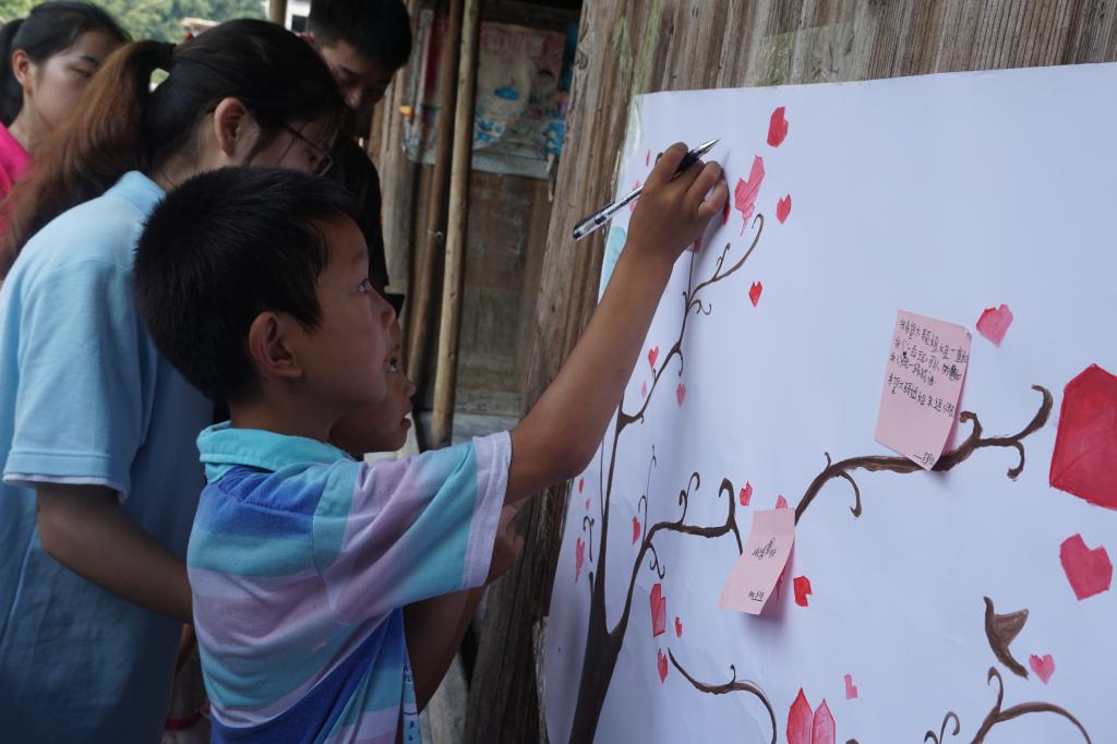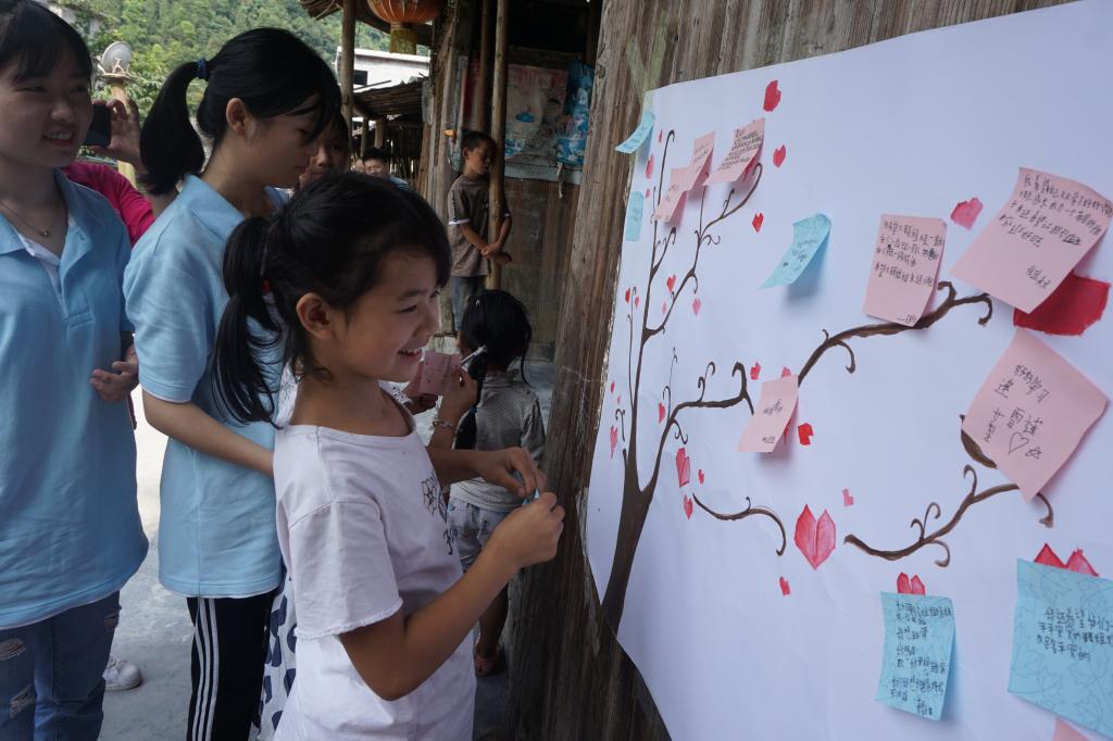 为了更好地帮助这些孩子,太阳成集团tyc122ccvip定期给这里的孩子寄出爱心包裹。今年暑假,太阳成集团tyc122ccvip实践队成员们再次来到营盘村小学,开展了为期一周的教育关爱活动,其中为了更好地开展爱心包裹项目、了解孩子们的需求,实践队员们特地准备了“心愿树”活动。活动伊始,孩子们安静地坐在座位上,等待实践队员们为大家分发笔和纸。孩子们拿到笔后,实践队员在一旁耐心地与孩子们沟通,逐步引导孩子讲出自己的心愿,孩子们低头认真地在纸上写着自己的愿望。写好自己的心愿后,孩子们小心翼翼地将心愿纸贴到心愿树上,两只小手用力地将它粘在上面,期盼着他们的愿望能够早日实现。