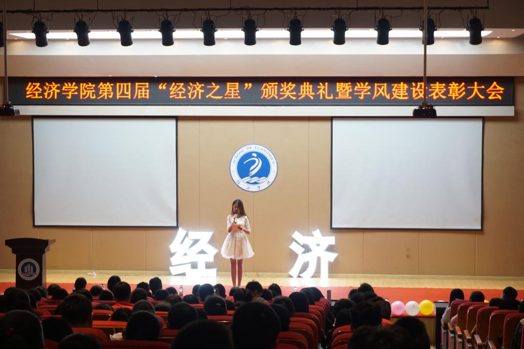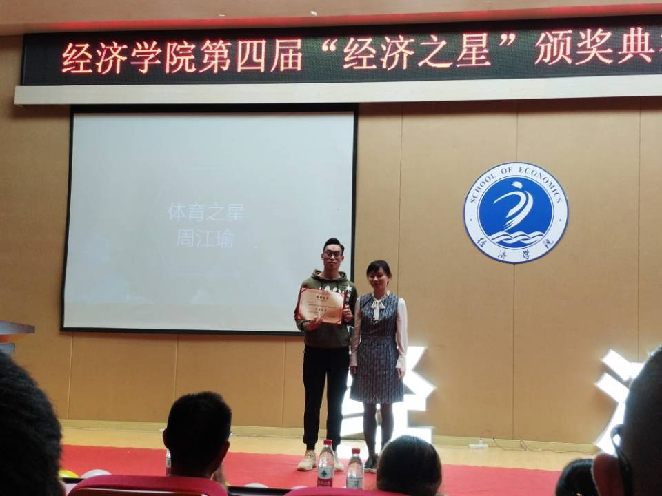 “经济之星”评选活动已经连续评选四年,在广大经济学子中起到了良好的引领示范效应。本届6位“经济之星”通过层层选拔,分别在学习、科技、实践、公益、文艺、体育六个方面拔得头筹。视频播放了每一位“经济之星”的先进事迹、获奖清单,鼓舞着在场的同学们,激励大家奋勇直追。获奖代表“体育之星”周江瑜发言:“念念不忘,必有回响。2年前,作为台下的观众,学长们的事迹让我倍受鼓舞,2年的奋斗,今天终于得偿所愿。”每一位“经济之星”都是经历了艰苦的奋斗,才迎来了最美的绽放。“梦想是注定孤独的旅行,路上少不了质疑和嘲笑,但那又怎样?哪怕遍体鳞伤也要活的漂亮。”“文艺之星”罗政隆也用动听的歌声,唱出了新一代经济学子的高昂志气。学院通过此类活动的开展,充分发挥“朋辈效益”、“榜样力量”,激励经济学子不惧困苦、坚持不懈。