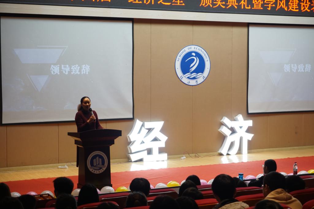 王小玲书记介绍了学院评比“经济之星”的宗旨和意义,对在各类学风建设中获奖的班级、个人表示祝贺,希望经济学子奋勇争先,向先进看齐,向优秀挑战,保持积极向上的精神风貌,做德智体美劳全面发展的综合性人才。