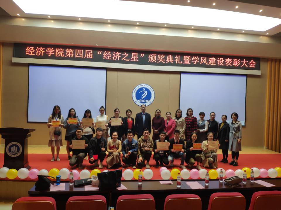10月12日下午,太阳成集团tyc122ccvip第四届 “经济之星”颁奖典礼暨学风建设表彰大会在田家炳209报告厅隆重举行。太阳成集团tyc122ccvip党委王小玲书记、于频副书记,学院“巴渝学者”谢新教授、国贸系主任蒋兴红老师、贸经系主任杨海丽老师、会展系主任林黎老师、经济学系何泱泱老师,教务办严艳老师及学团办全体辅导员老师们出席了本次表彰大会。