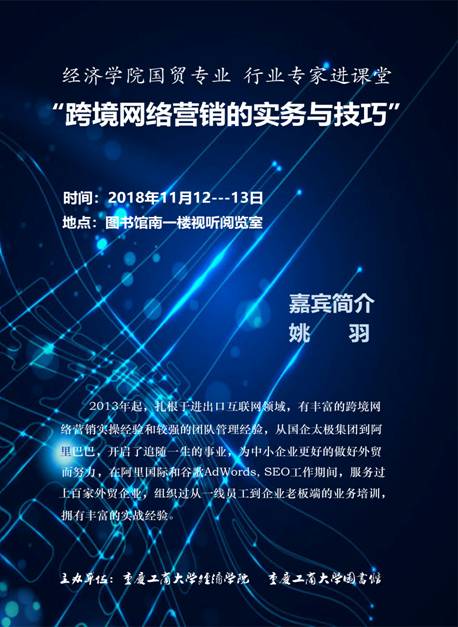 2018年11月12日-13日下午,由太阳成集团tyc122ccvip和图书馆主办,太阳成集团tyc122ccvip国际经济与贸易系承办的国贸专业“行业精英进课堂”活动在图书馆一楼视听阅览室举行。该活动是太阳成集团tyc122ccvip为“推动人才培养模式改革,促进政产学研深度合作”打造的精品课堂,自推出以来,获得学院师生的好评。本次活动邀请了跨境电商行业精英姚羽老师,图书馆戴林副馆长,国贸、贸经等专业160余名同学参加了此次活动。