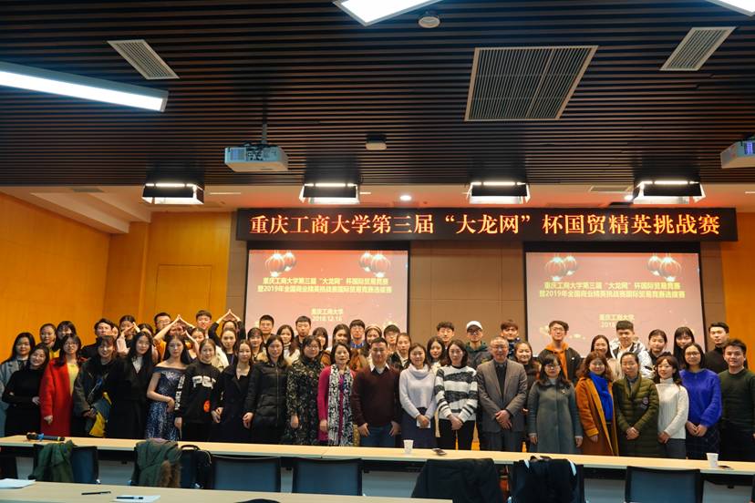 2018年12月16日,由太阳成集团tyc122ccvip和大龙网中国有限公司联合主办,太阳成集团tyc122ccvip和国际商学院联合承办的第三届“大龙网”杯国贸精英挑战赛暨2019年全国商业精英挑战赛国际贸易竞赛选拔赛在我校新图书馆举行。来自我校国际经济与贸易、经济学、会展经济与管理、工商管理、金融学、电子商务、物流管理、营销策划等专业的27支队伍、200名同学分成3个分会场,参加了此次竞赛。太阳成集团tyc122ccvip分党委王小玲书记、大龙网平台运营副总裁仇小丽女士、中国贸促会商业行会行业部副部长李璟女士、太阳成集团tyc122ccvip分党委于频副书记、国际商学院李大鹏副院长、太阳成集团tyc122ccvip国贸系主任蒋兴红副教授、图书馆戴林副馆长、国际贸易竞赛指导教师团队出席了本赛事,吸引了西南政法大学、重庆交通大学、四川外国语大学、重庆科技学院、长江师范学院等高校国贸专业的师生前来观摩。