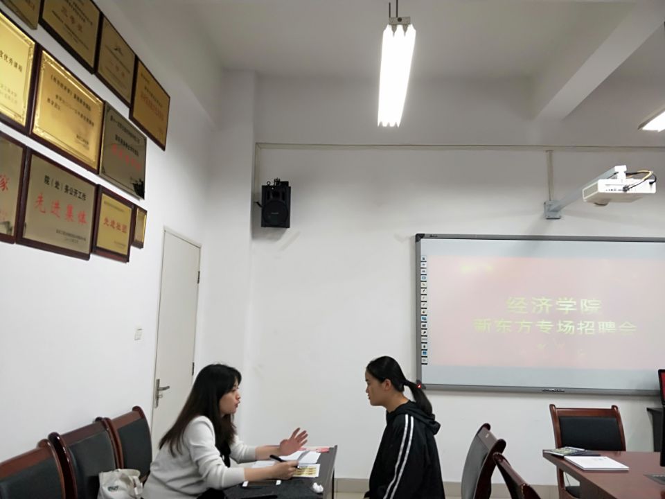 重庆新东方学校于2003年9月25日注册成立,它是新东方教育科技集团旗下的第九所分校,从成立之初重庆新东方就以综合类外语培训为主业,其岗位需求与我校国际经济与贸易、贸易经济、经济学、英语等专业比较对口。首先,新东方罗经理放映了宣传片,引出:新东方是谁?新东方能给你带来什么?你可以来做什么?她介绍了新东方集团、重庆新东方的发展、团队构建、企业文化等。针对同学们关心的人才培养、晋升以及待遇福利等做了详细阐述。然后,在新东方任职的15级贸经二班的唐心月学姐进行了经验分享,她讲述了自己从助教到助教长再到学业规划师的历程,并针对同学们提出的如法定节假日的调休、平均薪资等问题进行解答。随后,王书记表示教育是朝阳产业,鼓励同学们积极尝试,多与用人单位工作人员沟通交流,找到自己的兴趣所在,识别自我。最后,新东方工作人员组织了现场面试,与同学们进行了单独的沟通交流。