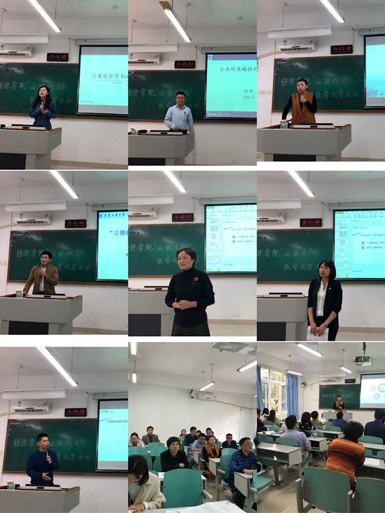 活动第二阶段包含新进教师说课、骨干教师教学创新示范课、骨干教师教学经验分享三个环节。第一环节中新进教师代表邹圆老师、彭青青老师代表分别展示了《策略性广告》和《计量经济学》的教学设计,并对课程内容进行讲解。第二环节为市级比赛参赛教师创新示范说课。其中,孙畅老师通过《西方经济学》教学示例着重讲解了课堂组织以及教学内容传授的创新形式,鼓励开展项目式教学等新兴教学模式;张驰老师演示了雨课堂的使用,示范线上线下混合教学的优势;刘晗老师就《区域经济学》课程思政内容做分享,探讨习近平新时代中国特色社会主义经济思想进课堂。第三环节由校级教学竞赛获奖者张文爱老师围绕教师应如何站好讲台这一话题,从热爱、尊重、专业和方法四个维度对教学经验进行了分享。