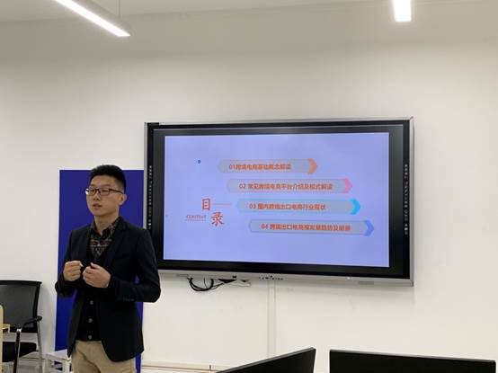 2019年11月19日上午,国贸系企业专家进课堂活动继续深入开展,本次活动邀请到大龙网集团高级运营经理李友辉进行了题为《跨境电商平台模式解读及发展新趋势》的讲座。在讲座中,李友辉经理就跨境电商发展的总体情况,及经过市场洗牌后不同平台所发生的的变化与改革,并就跨境电商未来发展的趋势进行了深入探讨。在跨境电商发展方面,李友辉经理提出了四个发展阶段:1、萌芽期,2004-2007年,共发布3项政策,初步规范电商行业发展,侧重于规范行业。2、发展期,2008-2012年陆续发布10项政策,涉及监管、支付结算及试点等方面,政策呈点状分布,侧重支持引导。3、爆发期,2013-2014年集中发布10余项政策,政策呈面状铺展,政策主要集中在出口方面,向实施层面推进。4、调整期,2015年至今,通过各种政策不断调整规范行业发展。在跨境电商发展新趋势方面,他提出如下观点:1、移动互联网技术将更为突出;2、更多大数据落地应用;3、海外本土化服务加强;4、海外本土化服务加强。