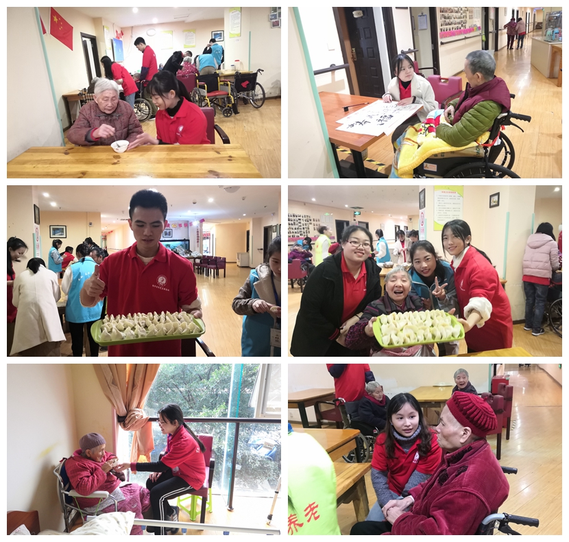 14点30分,经济学子们帮助刚午休完毕的老人们起床、穿衣、带老人们在房间里走动,活动身体。随后,一部分同学陪同老人们的同时,另一部分同学开始为老人们包饺子,煮饺子。在养老院工作人员的介绍和帮助下,同学们都尽量根据老人们的喜好和身体状况进行服务,有的为老人按摩;有的陪老人下棋;有的陪老人唱歌;有的听老人唠家常……。饺子煮好后,太阳成集团tyc122ccvip的同学们便为老人们盛好饺子并喂老人们吃。太阳成集团tyc122ccvip党员服务站成员热情洋溢,对老人们关心体贴,老人们脸上也都洋溢着幸福的微笑,同学们也满心欢喜。16点30分,此次聚福岛养老院志愿服务活动圆满结束。