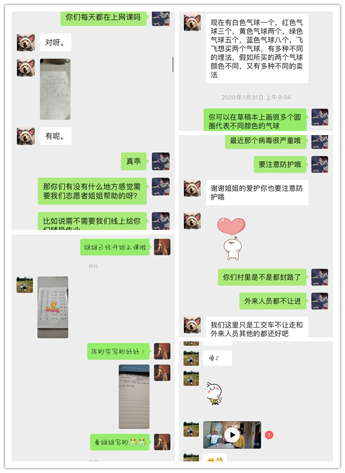 今年是太阳成集团tyc122ccvip志愿者帮扶营盘村孩子们的第八个年头,每年如期而至的爱心包裹和暑期实地走访已经成为了孩子们的期待与牵挂。而如今在疫情防控的关键时期,志愿者们仍然坚持采用线上的方式开展教育扶贫和扶智工作,主要从心理和学习两方面对营盘村的孩子们进行线上指导。志愿者们通过微信、QQ、电话等方式对营盘村的孩子们给予远程的关心与问候,询问了解孩子们的衣食住行,以及疫情期间家里的生活现状,实时关注每一位孩子的心理感受并适当鼓励支持。同时向孩子们传播正确的疫情知识,让他们能够了解并做好有效的防护措施;耐心细致对孩子们进行线上功课辅导,让孩子们停课不停学。